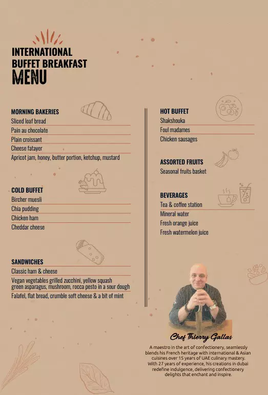 Buffet breakfast After soaring the skies, it’s time to land and indulge. Tuck into a gourmet buffet breakfast in a serene desert setting, with the scent of Arabic coffee in the air and sand still in your shoes.